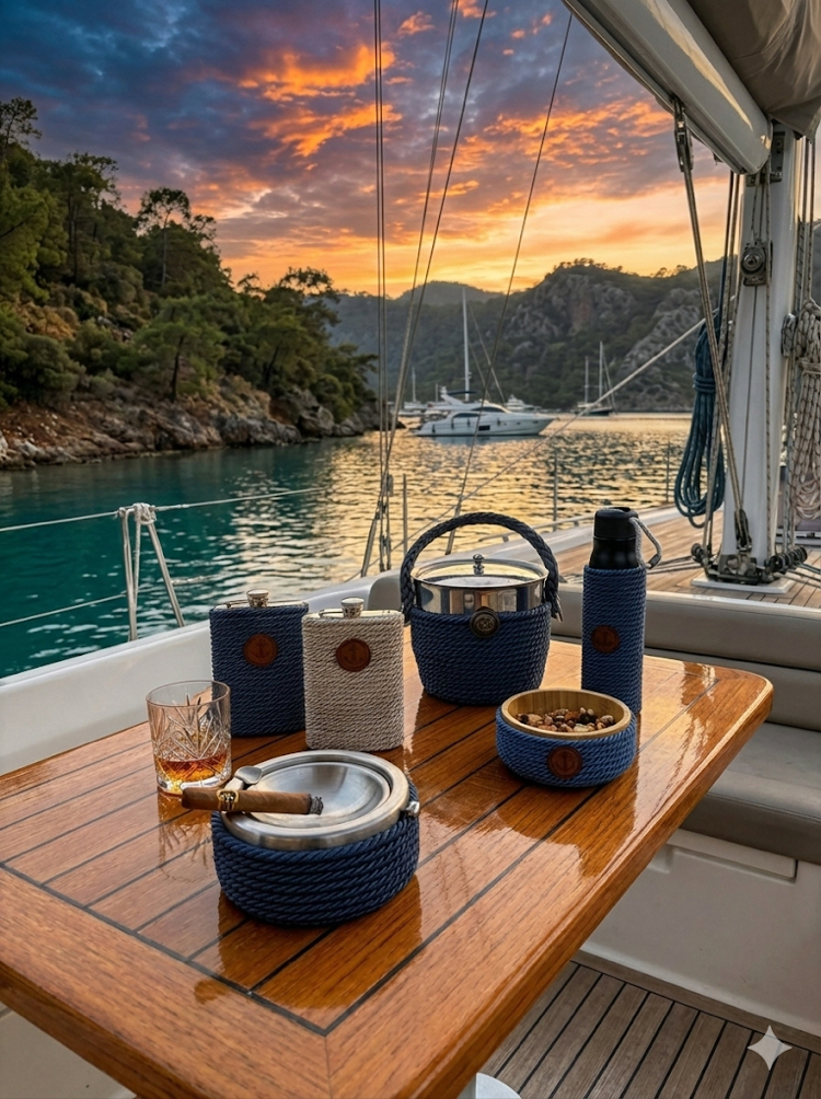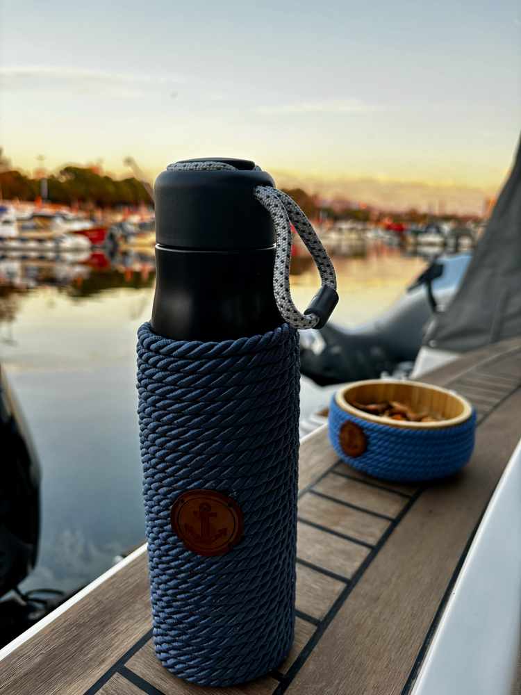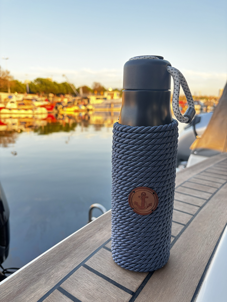 Denizin ruhu hep yanınızda. El emeği, şık marin halatlarla örülmüş, estetik ve zarafetin en şık hali. Denizin huzuru ve dinginliği taze kahve kokusuyla bu özel tasarım termosta buluştu.